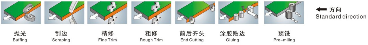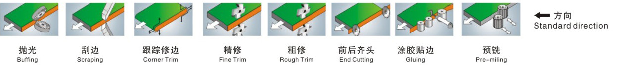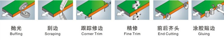 This machine is specially designed for overseas market.It is used for MDF,wooden board and shaving board.It can complete the processes of feeding workpiece,feeding coiled material,cutting,end trimming,fine trimming,scraping and buffing . It is especially suitable for the factory producing board furniture.