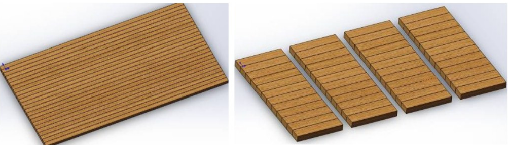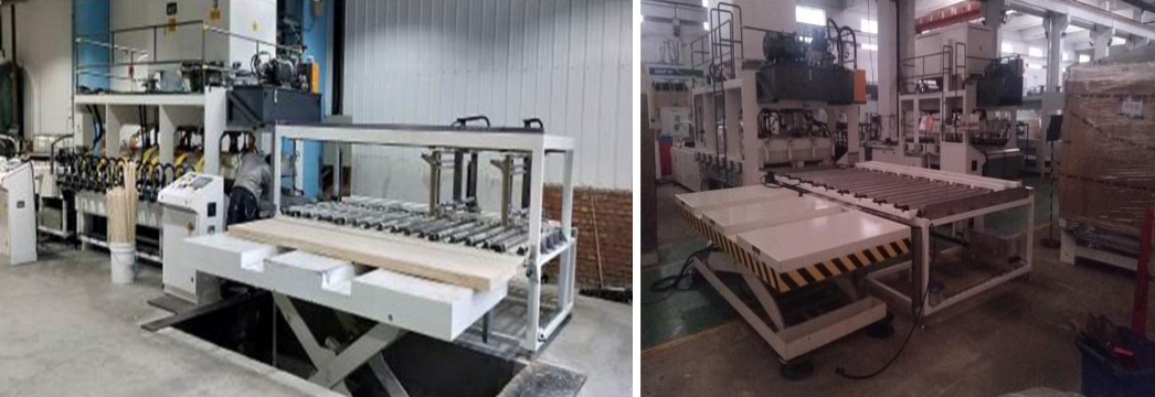 After high frequency splicing, the wooden slats are assembled into wooden boards, which are transmitted to the electric roller platform by chain plate transmission and electric roller relay. After reaching the position, the slats are pushed out horizontally by Transverse translation heads, and the height of board is adjusted through electrical automatic detection and control, then put the wood boards order on the lifting platform.